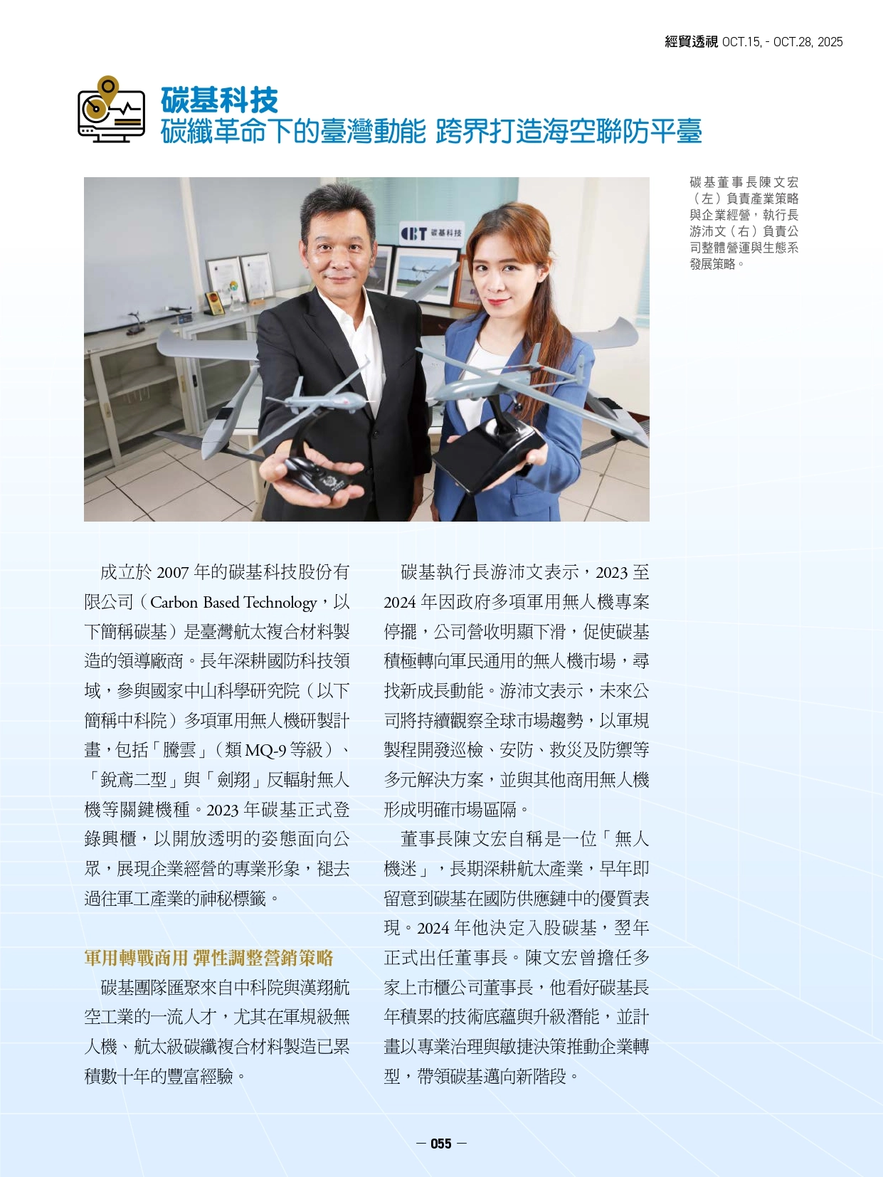 成立於2007年的碳基科技股份有限公司(Carbon Based Technology,以下簡稱碳基)是臺灣航太複合材料製造的領導廠商。長年深耕國防科技領域,參與國家中山科學研究院(以下簡稱中科院)多項軍用無人機研製計畫,包括「騰雲」(類MQ-9等級)、「銳鳶二型」與「劍翔」反輻射無人機等關鍵機種。2023年碳基正式登錄興櫃,以開放透明的姿態面向公眾,展現企業經營的專業形象,褪去過往軍工產業的神秘標籤。