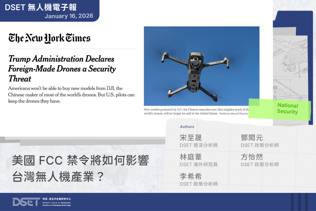 本期雙週報指出,美國聯邦通訊委員會(FCC)於 2025 年底將所有非美國製無人機及其關鍵零組件 #納入國安列管,對中國無人機產業衝擊最為明顯,也為非紅供應鏈釋出前所未有的市場空間。台灣業界整體保持樂觀,但尚未取得豁免資格的新機型,仍面臨制度面的不確定性。文中也一併解析 #豁免 FCC 新規之 #四種途徑。
